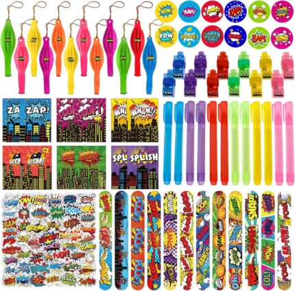 122 Pcs Superhero Party Favors with Slap Bracelets,Punch Balloons,Superhero Stickers,Button Pin Badges,Notepads,Pen,Finger Lights for Superhero Themed Goody Bag Stuffer Class Prize