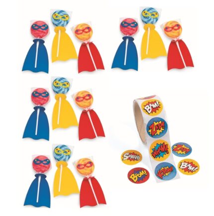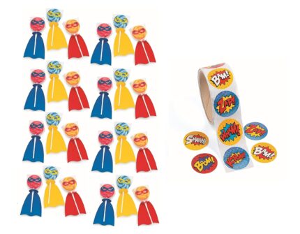 Fun Express Superhero Party Favor Bundle, 24 Superhero Lollipops, 100 Superhero Stickers, Enough for a Set of 24 Party Favors & Birthday Party Pack forTreat Bags