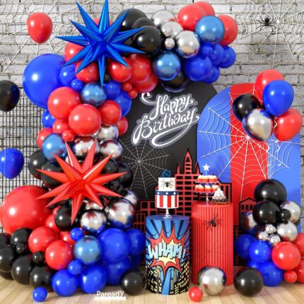 Paready Red Black Blue Balloon Arch, 120 Pcs Matte Red Blue and Black Balloon Garland, Royal Blue Metallic Silver Blue Red Star Foil Balloons for Boys Men Birthday Superhero Theme Party Decorations