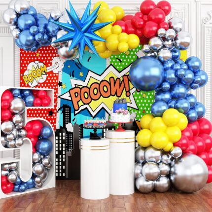 Red Yellow Blue Balloon Garland Arch Kit, Colorful with Metallic Blue Red Yellow Green Metallic Silver Balloons Supplies for Birthday, Carnival, Superhero, Robot Blocks, Video Game Themed Party