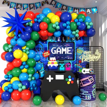 Red Blue Green Yellow Balloon Arch, Red Yellow Green Blue Balloon Garland with 4Pcs Star Foil Balloon for Super Bros Birthday Baby Shower Cartoon Video Game Superhero Theme Party Decor