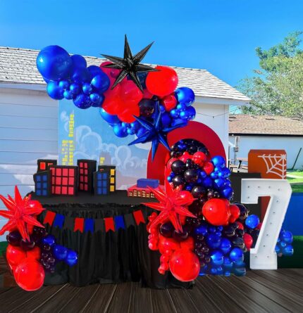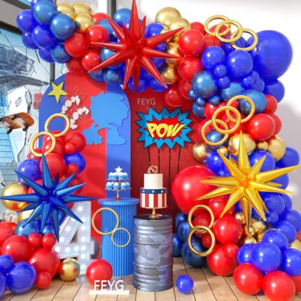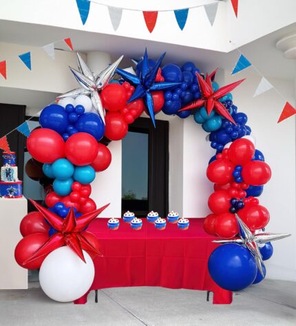 red blue and white balloon garland arch kit 150pcs with starburst balloons for Cartoon superhero spider theme Birthday july 4th patriots day party decorations