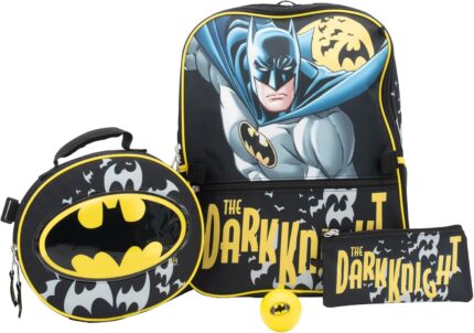 BATMAN 4 Piece Dark Knight Backpack Set, Kids School Travel Bag with Front Zip Pocket, Foam Mesh Side Pockets, 3D Insulated Lunch Box, & Squish Ball Dangle, Black