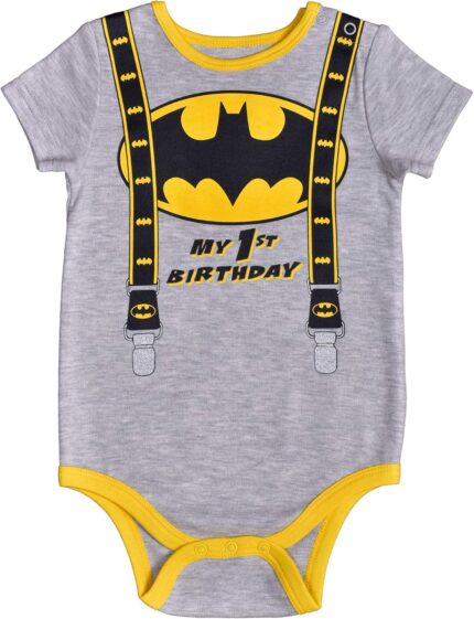 BATMAN DC Comics Boys First Birthday Short Sleeve Bodysuit Creeper for Infants – Grey