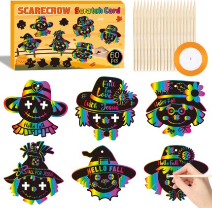 WATINC Fall Scarecrow Scratch Cards – 60pcs Autumn Scratch Art Crafts Kit for Kid, DIY Magic Animal Hanging Paper, Harvest Thanksgiving Sunday School Classroom Thankful Activities Project