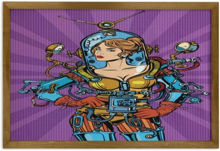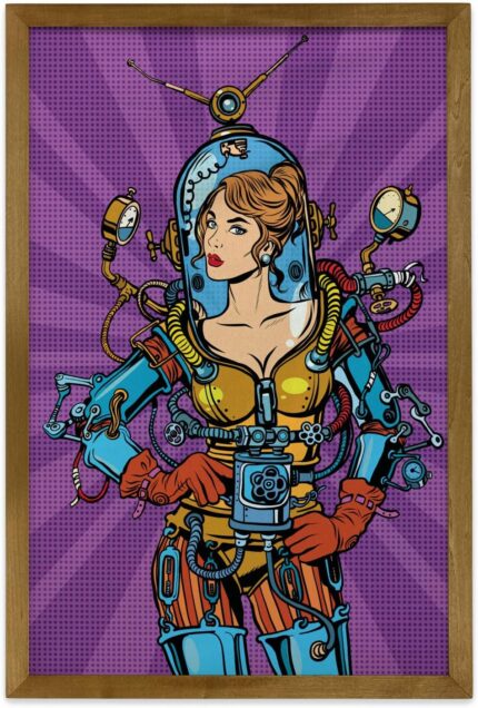 Ambesonne Fantasy Framed Wall Art, Futuristic Super Hero Woman Space Astronaut Science Fiction Graphic, Fabric Poster with Walnut Tone Wood Frame Home Dorm Decor, 23″ x 35″, Purple Sky Blue Marigold