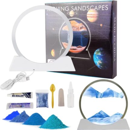 Moving Sand Art Picture in Motion DIY Kit, Round Glass 3D Deep Sea Sandscapes with Display Flowing Sand Frame for Relaxing Desktop Home Office Work Décor, Making kit for kids adults(Blue,12inch)