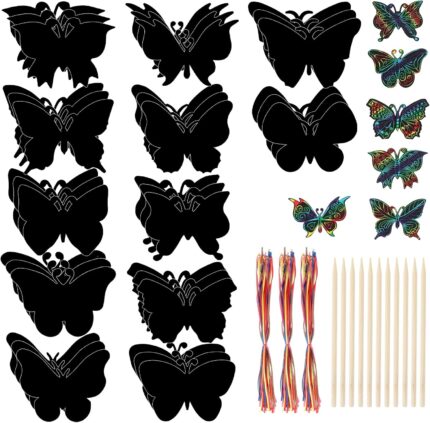 simarro 36Pcs Butterfly Scratch Cards, 12 Styles Rainbow Scratch Crafts Butterfly Party Favors with 12 Bamboo Stylus for DIY Crafts Home Decoration Art Project Games