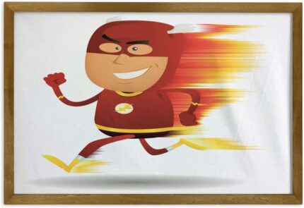 Ambesonne Superhero Framed Wall Art, Lightning Bolt Man with Cape and Fast Fun Cartoon Character Art Print, Fabric Poster with Walnut Tone Wood Frame Home Dorm Decor, 35″ x 23″, White Red