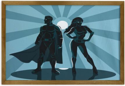 Ambesonne Superhero Framed Wall Art, Man and Woman Superheroes Costume Capes Night Protector in Moonlight, Fabric Poster with Walnut Tone Wood Frame Home Dorm Decor, 35″ x 23″, Blue Teal