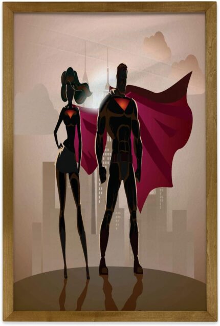 Ambesonne Superhero Framed Wall Art, Super Woman and Man Heroes in City Solving Crime Hot Couple in Costume, Fabric Poster with Walnut Tone Wood Frame Home Dorm Decor, 23″ x 35″, Beige Brown Magenta