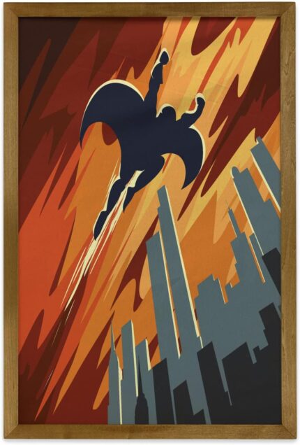 Ambesonne Vintage Framed Wall Art, Silhouette of a Superhero over Apartments in Sky Night Fiction Comic Image, Fabric Poster with Walnut Tone Wood Frame Home Dorm Decor, 23″ x 35″, Red Orange Grey