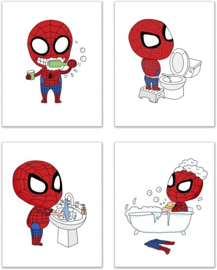 Spiderman Bathroom Prints – Set of 4 (8 inches x 10 inches) Wall Art Decor