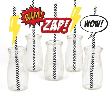 Big Dot of Happiness Bam Superhero Paper Straw Decor – Baby Shower or Birthday Party Striped Decorative Straws – Set of 24