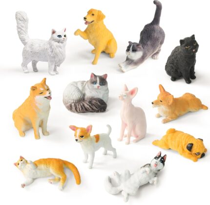RECUR Cats and Dogs Animal Figurines Desk Pets Miniature Figure Cake Topper, 100% Hand-Painted, Mini Pets Figure for Kids – 12 PCS
