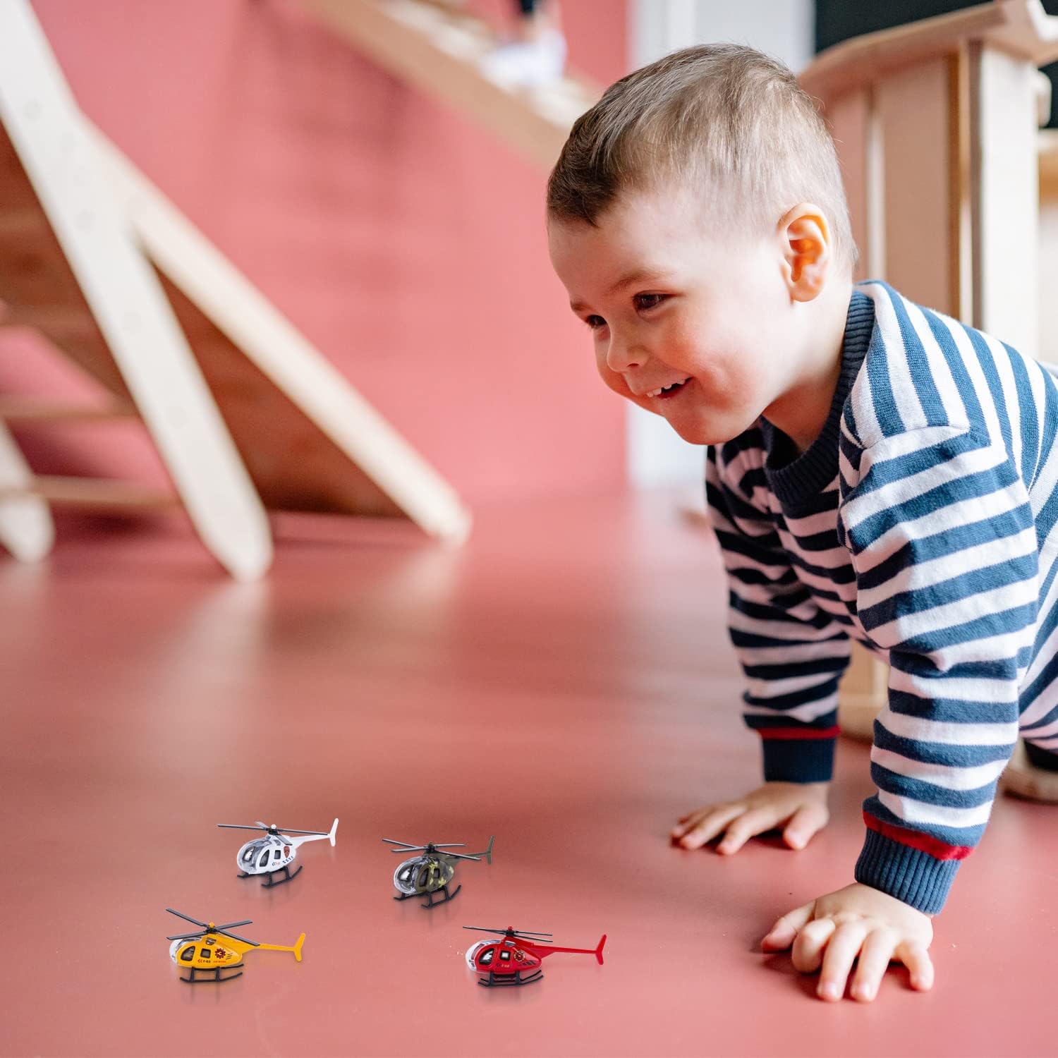 【SUPER REALISTIC DESIGNS】Super value diecast helicopters playset contains 4 pcs helicopter airplane toys: a police helicopter, a fire helicopter, and a engineering work helicopter, a military helicopter. Each with spin-able propellers and a vibrant touch of color. Each size about 3.5×1.5 inches.