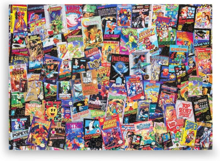 Cool Design: Assembled puzzle measures 28 x 20 inches, featuring a nostalgic throwback design. The retro-style collage depicts an array of vintage video games, including Super Mario Brothers, Pac-Man, Tetris, Final Fantasy, and many more