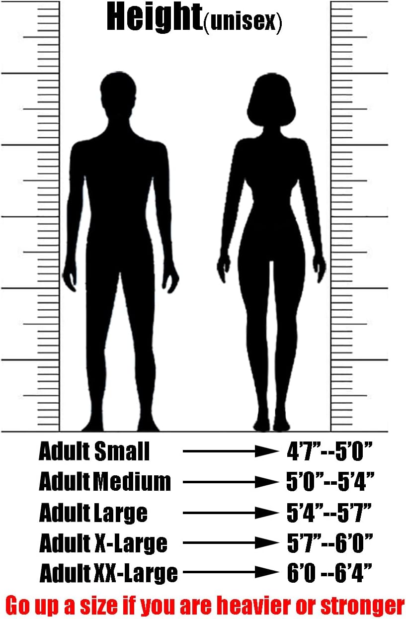 Please see our Size Chart(Adult Unisex,based on height). Small 4’7″ — 5’0″ Medium 5’0″ — 5’4″ Large 5’4″ — 5’7″ X-Large 5’7″ — 6’0″ XX-Large 6’0″ — 6’4″ Note: Go up a size if you are heavier or stronger.