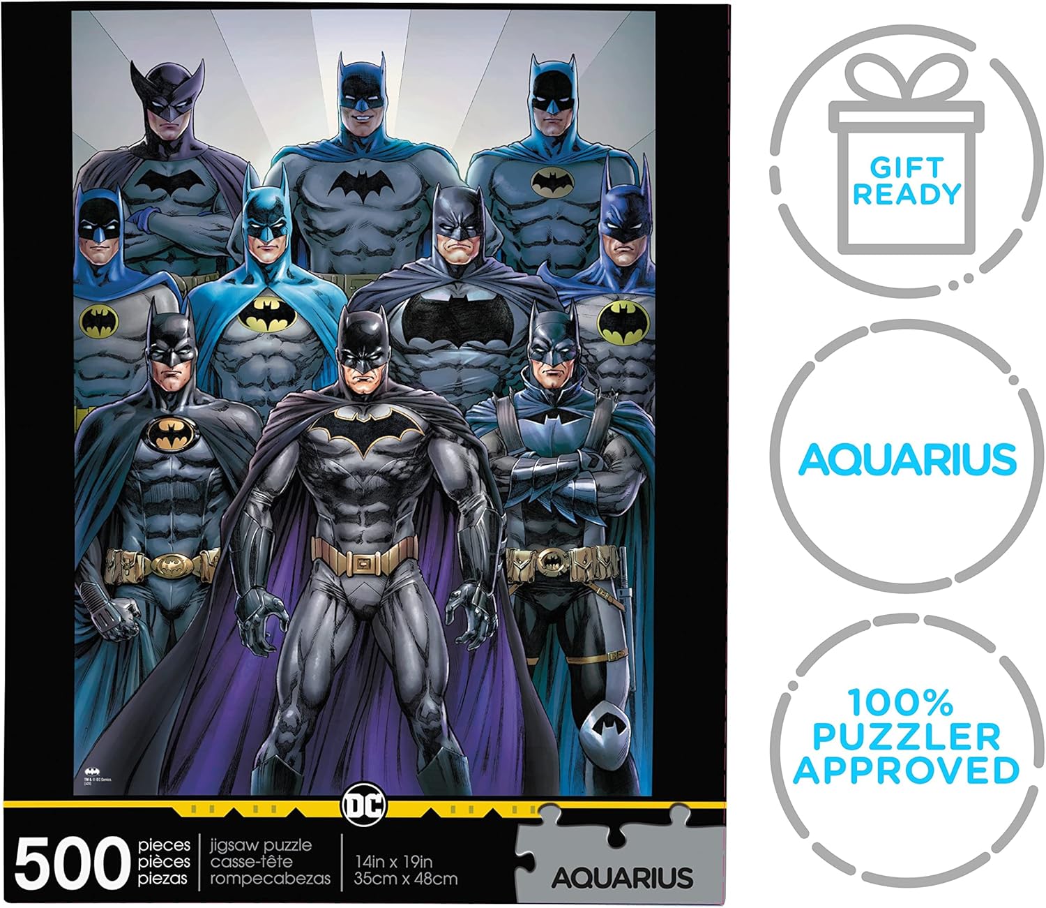 UNLOCK YOUR INNER SUPERHERO Charge into the DC Universe with Batman, and rise to the challenge of completing this 500 piece puzzle depicting the Dark Knight as he appeared over the decades. The completed puzzle measures 14 x 19 inches. LOOKING FOR DC COMICS GIFTS? This DC puzzle is the ultimate DC Comics gift for Batman fans and DC fans of all ages. Perfect for family puzzling, game night, birthdays, Holidays, kids and adults will absolutely love receiving it. PREMIUM QUALITY YOU CAN TRUST: Our precision cutting technique ensures a perfect fit of all puzzle pieces, leaving virtually no puzzle dust behind. We use thick quality paper that is glare-free so you can show off your masterpiece with pride. 100% OFFICIALLY LICENSED DC COMICS MERCHANDISE: All our DC Comics Puzzles are designed by AQUARIUS and are officially authorized by Warner Brothers. They’re the perfect piece of DC Comics collectible memorabilia to add to your collection. THE AQUARIUS PROMISE: It’s simple. We stand behind our products 100% and if you’re not completely satisfied with your purchase, we’ll offer you a full refund Click the yellow Add to Cart button today and buy with confidence. AQUARIUS games, puzzles, and playing cards are both a reflection of today’s favorites and a nod to the past and are designed to entertain young and old alike.