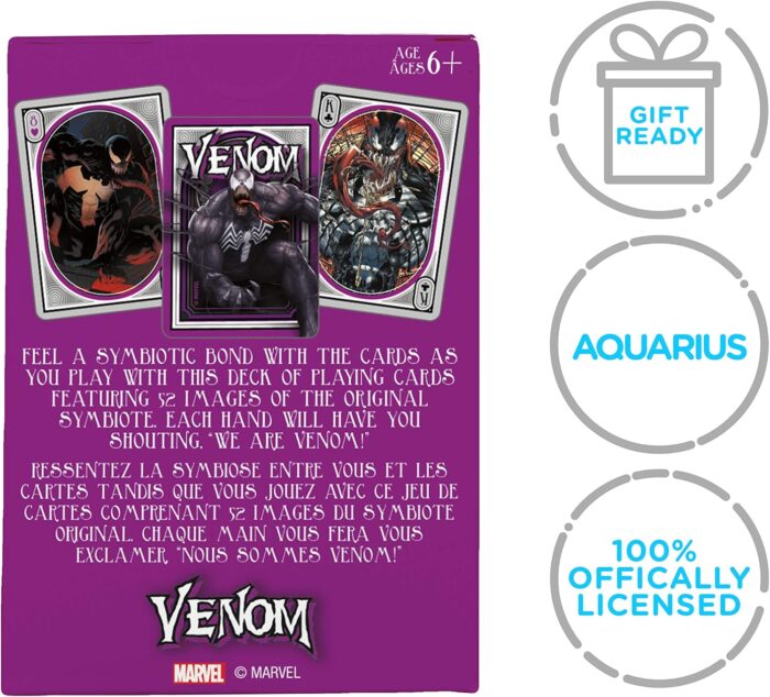 VENOM DECK OF PLAYING CARDS: Feel a symbiotic bond with the cards as you play with this deck of playing cards featuring 52 images of the original symbiote. Each hand will have you shouting,“ We are Venom!”