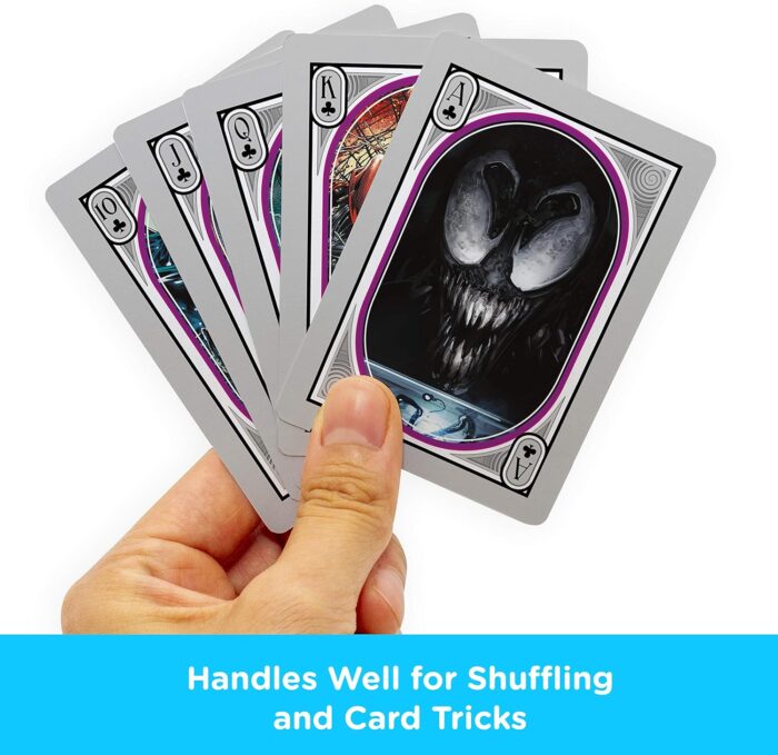UNIQUE DESIGN ON EVERY CARD: This Marvel Comics deck of playing cards includes 54 cards (52 playing cards and 2 jokers). Every single playing card features its own distinct Venom themed design and art. No two cards are alike