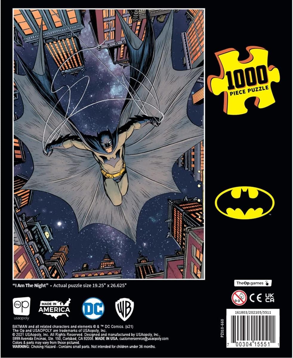 A fierce and unfurled Batman descends from Gotham City heights in this 1,000-piece jigsaw puzzle featuring a retro comic-style Caped Crusader centered amidst towers and a starry sky.