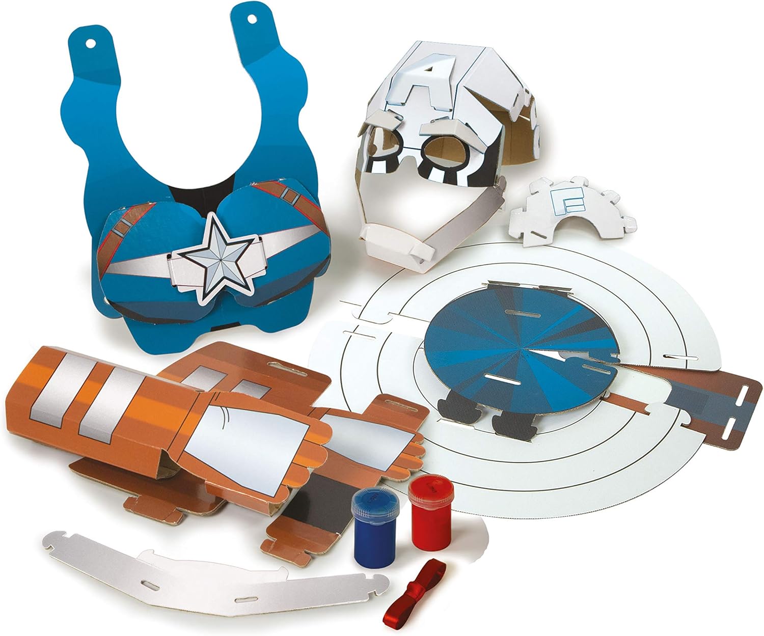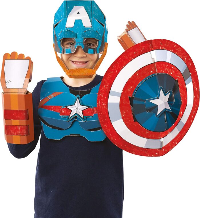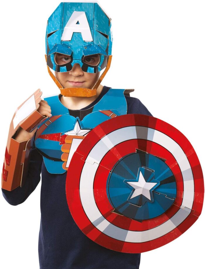The kit includes everything you need to assemble the Captain America helmet, shield and chestplate, and to play games impersonating this great superhero!