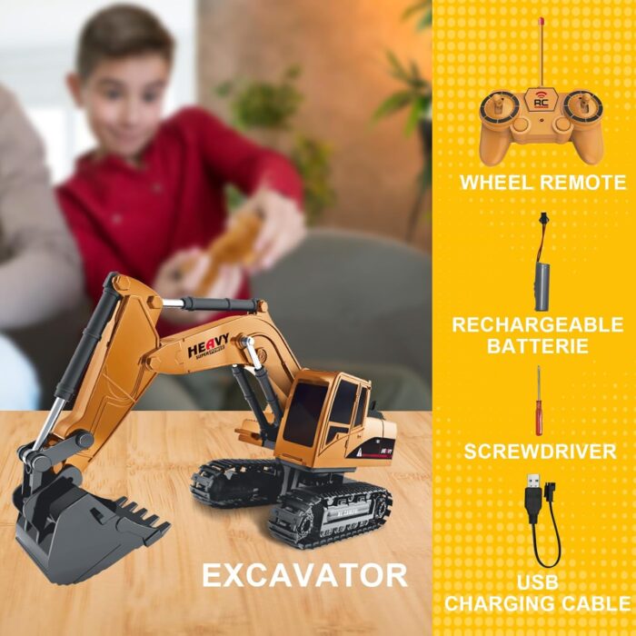 [PRACTICAL SAFE & HARMLESS MATERIALS] Our excavator is made of high quality plastic, more durable, not easy to wear and tear, won’t hurt your child’s little hands, our RC Excavator Playset comes with a USB charger, rechargeable batteries, controller and the RC Excavator itself.