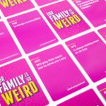 Are you ready to call out your family at game night? Our Family Is So Weird will have you cast your vote on hilarious prompts like who in your family #73 has no filter or #60 could fall asleep anywhere HOW TO PLAY: Gather at least 3 family members. Youngest person is the judge first drawing a card and reading it aloud. Everyone writes down their vote on who should get the card. Votes are revealed and player with the most votes gets the card. The judge decides who gets the card if there’s a tie. Sharing stories to explain your vote is encouraged. Round ends when a player reaches 7 cards.