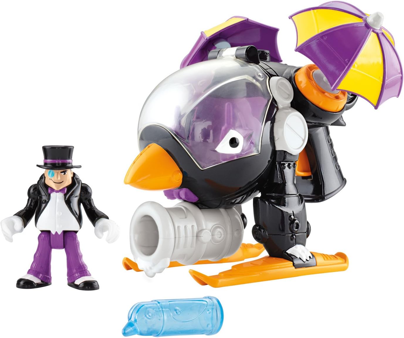 Who says penguins can’t fly This crazy bird is flying over Gotham City in The Penguin Copter, powered by umbrellas (of course)! Just pull the trigger to see them spin! What kind of evil plan is he hatching That’s up to young crime fighters’ imaginations. (HINT: It starts with pressing the button on his white cannon to fire an “icy” projectile at Batman.)