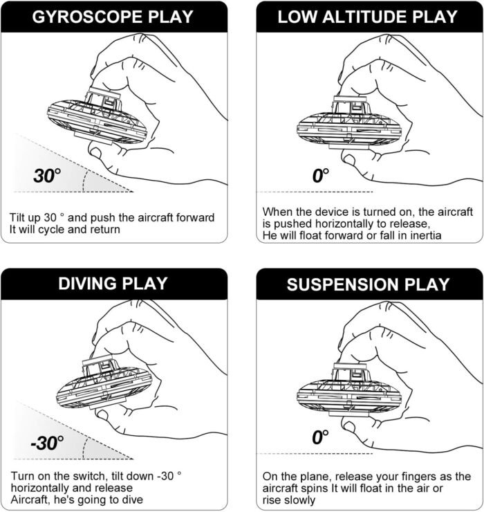 【Easy To Fly Drone】: Turn on the power button and hold the center axis and spin the wheel to start it, then give it a toss to get flying. Different throwing speeds and angles allow different flight paths, tricks, and high-speed maneuvers.