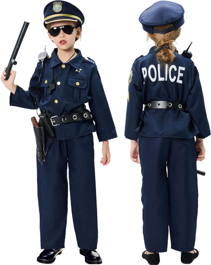12 Pcs COMPLETE POLICE COSTUME PLAY SET FOR KIDS – Shirt, Pants, Hat, Belt, Holster, Whistle, Walkie Talkie, Badge, Sunglasses, Handcuffs, Police Baton, etc. Super deluxe police costumes with abundant police accessories, will do make your little officer ecstatic!