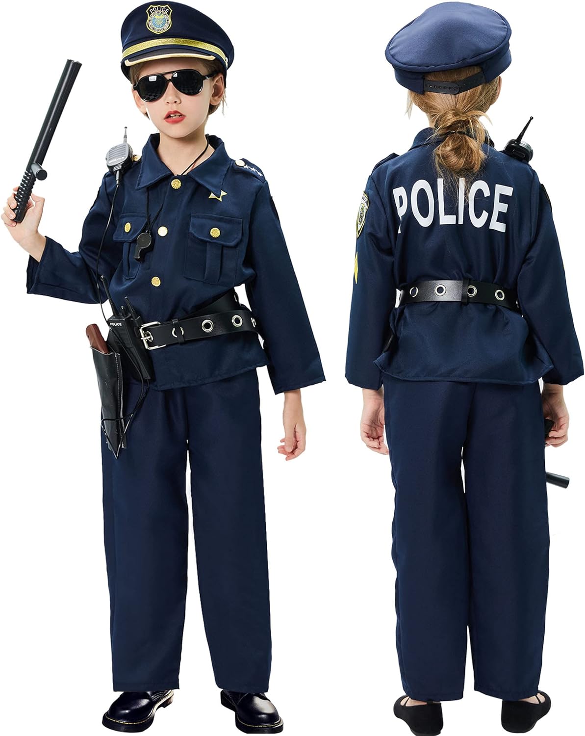 FUN MULTI-SCENARIO PLAY – Put on our police uniform and hat, Adjust the belt to fit around the waist, Put walkie-talkie on shoulder, with handcuffs around waist, Wear the badge, sunglasses, baton, be police in the community! Abundant Police accessories support children enjoyed playing with their imagination and simulate various situations.
