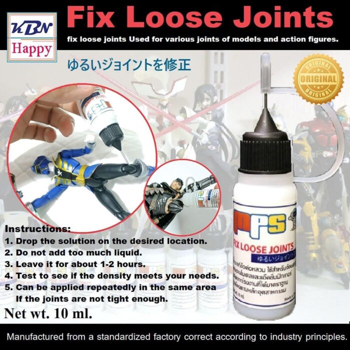 Used to fix loose joints for model work and all types of action figures Helps increase firmness which is worn due to play or use Products suitable for the job detachable Used for increasing the firmness of model work and All types of action figures by using with joints or joints that has been worn due to playing or using it for a while Can be used with plastic, rubber, wood, metal, resin, etc. When it’s dry will look like hard rubber can hit water high security not sticky Instructions: 1. Apply the solution evenly throughout the joints. 2. Do not add too much liquid. 3. Leave it for about 1-2 hours. 4. Test to see if the density meets your needs. 5. Can be applied repeatedly in the same area If the joints are not tight enough. 6. The product is a brush head type. Suitable for disassembly models 7. Suitable for figures that can be taken apart.