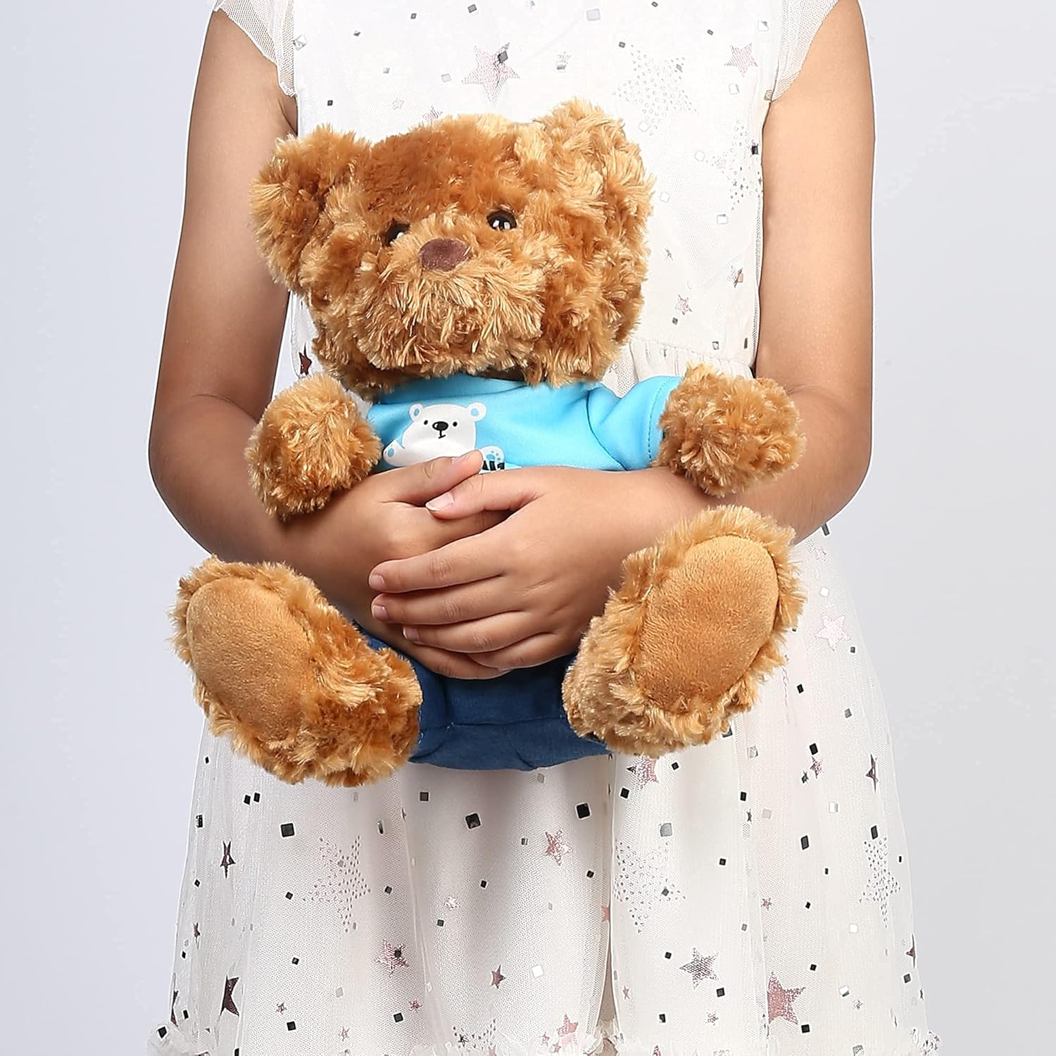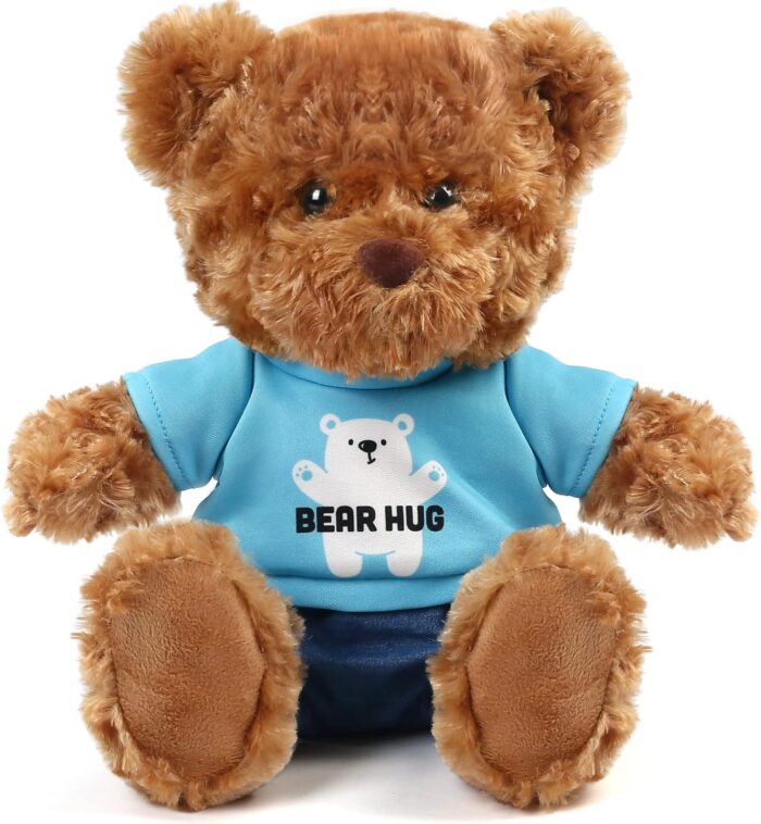 Huggable Teddy Bear: This bear with blue shirt stuffed animal is perfect for hugging and snuggling, resting on, and bringing smiles and comfort