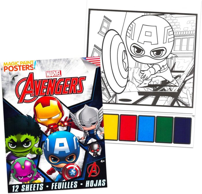 Avengers Magic Paint Poster pack includes 12 mini posters with paint right on the sheet — just dip a cotton swab or paint brush (not included) in water. Easy tear-and-share; perfect to post as Avengers wall art!