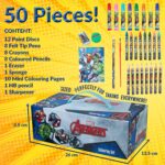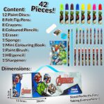 The contents of this Marvel art set includes: 12 watercolour paint discs, 8 colouring markers, 8 crayons, 8 colouring pencils, 1 mini colouring book, 1 HB pencil, 1 paint brush, 1 sponge, 1 sharpener, 1 eraser
