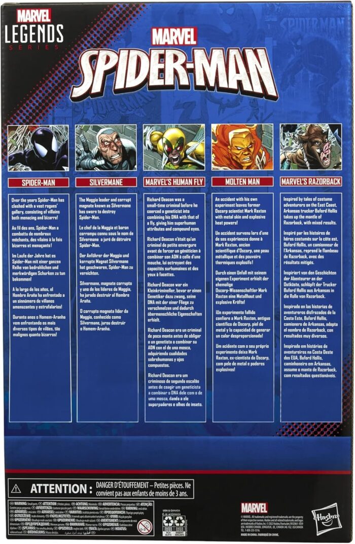 MARVEL SPIDER-MAN MULTIPACK: This Spider-Man action figure multipack features Spider-Man, Silvermane, Marvel’s Human Fly, Molten Man, and Marvel’s Razorback 6-inch-scale toys