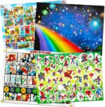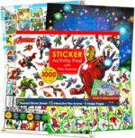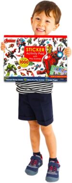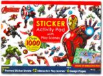Oversized sticker pad with over 1000 repositionable stickers featuring a variety of character themes and poses for endless creativity. Includes full color poster scenes and design pages for coloring fun.