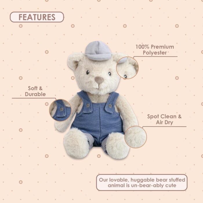 DRESSED TEDDY BEAR TOY – A child’s first bear stuffed animal must be special. Enter Mon Amie’s Eddie Overall Bear Plush Toy. Clad in handsome navy knit overalls and a jaunty grey hat, our lovable, huggable bear stuffed animal is un-bear-ably cute. Eddie’s charming face and super soft fur make this bear plush toy the paw-fect gift for a baby shower, birthday party or other momentous event in a little one’s life.