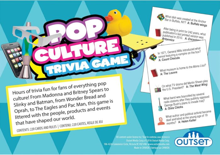 Hours of trivia fun for fans of everything pop culture including fashions, fads, and crazes. From Marlon Brando to Miley Cyrus, Walkmans to iPods and including questions about Slinky, Batman, Wonder Bread, Madonna, Britney Spears, the Eagles, Oprah and Pac Man, this game is littered with the people, products, and trends that have shaped our world from almost any generation. Quiz your family and friends to find out who knows the most about pop culture. Featuring 1200 trivia questions across the decades, Pop Culture Trivia spans the ages. Easy to play and there are no complex rules or game pieces to keep track of…just open and enjoy. For 2 or more players ages 12 years and up.
