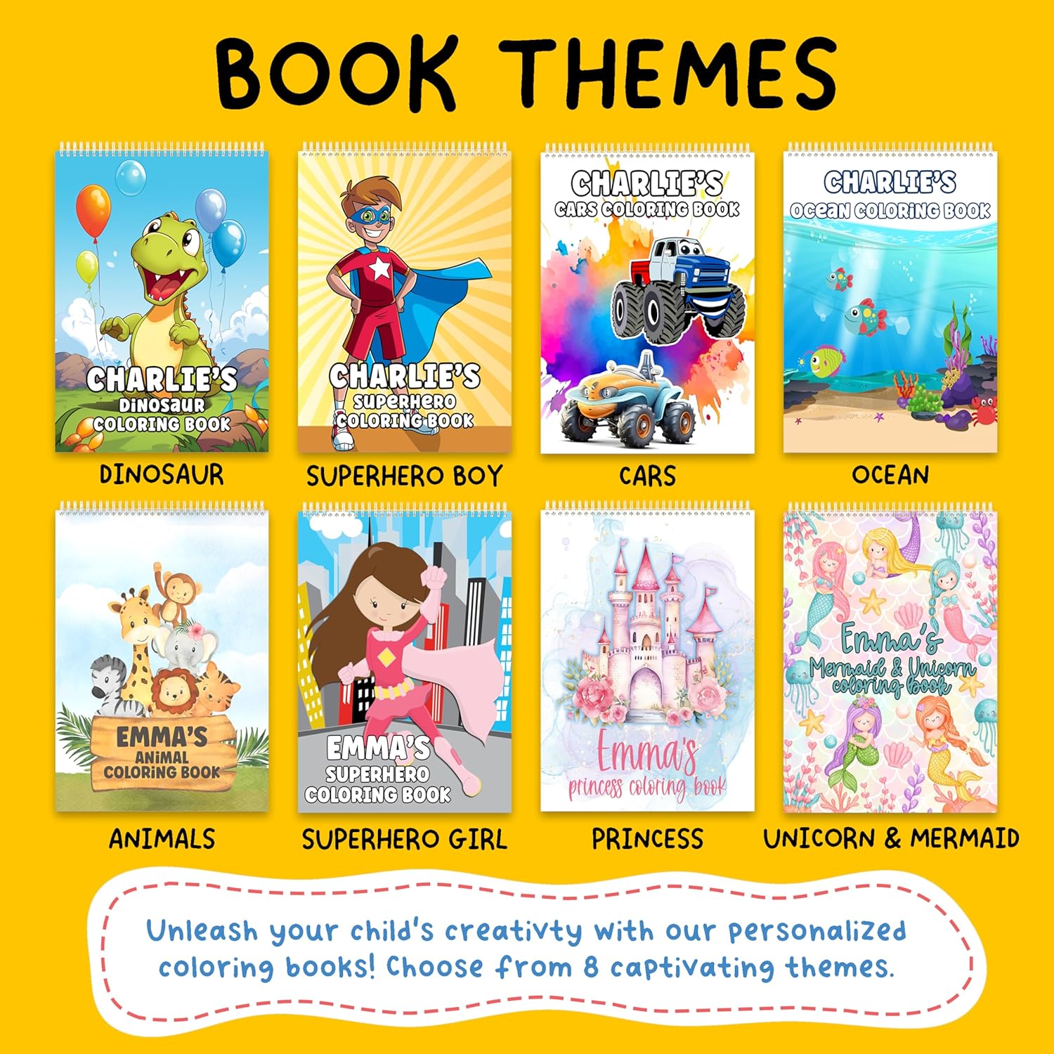 Welcome to our world of personalized kids color books! If you’re looking for a fun and educational activity for your little ones, our personalized coloring book is just what you need. This engaging children’s coloring book is designed to captivate their imagination and keep them entertained for hours on end. Our coloring book features a wide array of delightful illustrations that will spark your child’s creativity. From cute animals to enchanting scenes, each page is carefully crafted to provide endless coloring possibilities. And the best part? We personalize each book with your child’s name, making it an extra-special gift they’ll treasure. Whether it’s a birthday or holiday celebration, our personalized coloring book is the perfect present. Watch your child’s face light up with joy as they see their name beautifully integrated into the colorful pages. It’s a truly unique and thoughtful gift that will make any occasion memorable. One of the fantastic features of our coloring book is its portability. It’s specifically designed to be a travel-friendly activity for toddlers. The compact size and lightweight design make it easy to slip into a bag or carry-on, ensuring your child is entertained on-the-go. Whether it’s a long car ride, a plane journey, or a vacation, this coloring book will keep your little one engaged and occupied. Each coloring book includes 32 pages. All of the pages are personalized.