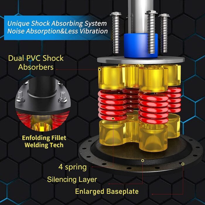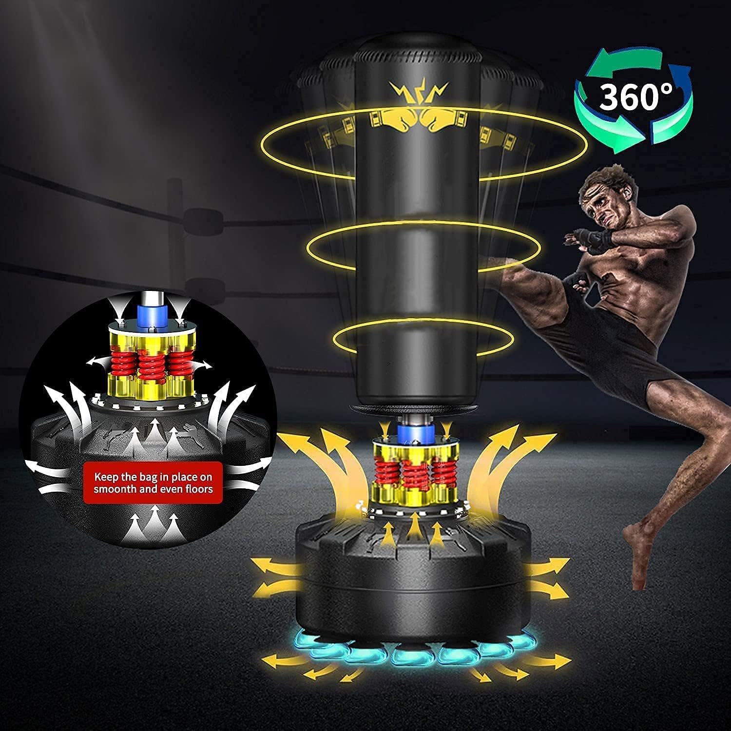 【Stable Punching Bag with Stand】-7.5MM thicken ABS base bears 140kg weight easily, supported by 12 strong suction cups help keep the kickboxing bag with stand in position on smooth and even floors, the base weighs up to 205lbs when filled with sand for max stability (Base will be more stable if filled with sand than water) ;4 springs deliver 15-45° fast-rebound, 2 absorbers achieve 360° shock and noise absorption during your boxing, punching, hitting, kicking.