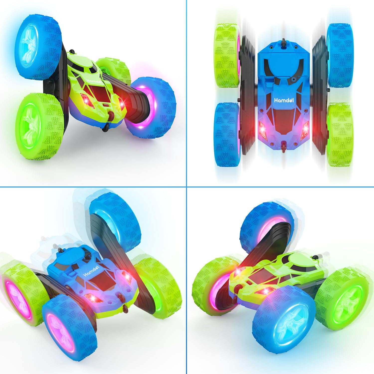 Hamdol Remote Control Car adopts four-wheel independent suspension system, which can easily achieve 360° flip, moving forward and backward, turn left and right, double-sided driving! Equipped with two motors, maximum speed to 10KM/H on land. Dual batteries can be used alternately to extend kid’s funning time. Handsome double-rocker 2.4GHz controller allows multiple racers to play together at the same time without interference. Durable shell material, soft tires, can easily conquer no matter the land, sand and grass.
