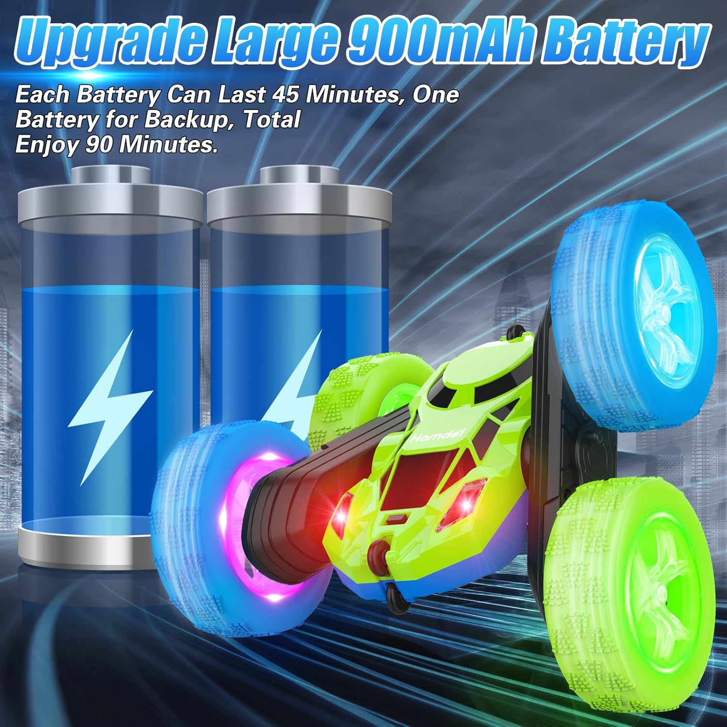 Endless Fun: Our Remote Control Cars guarantees longer playing time for kids with its rechargeable 900mAh batteries, kids can enjoy about 70 minutes of driving fun(35 minutes per battery). It can make amazing 360° rotating and flipping, double-sided driving, 4WD, forward and backward are very simple and easy to operate, making it perfect for indoor and outdoor play