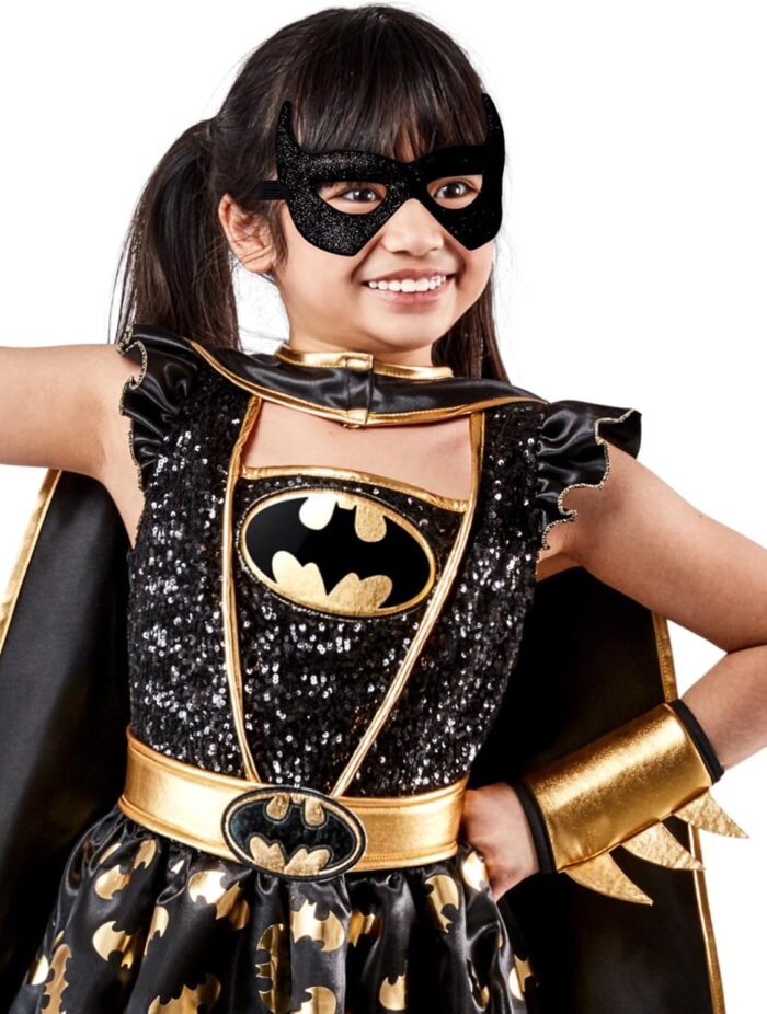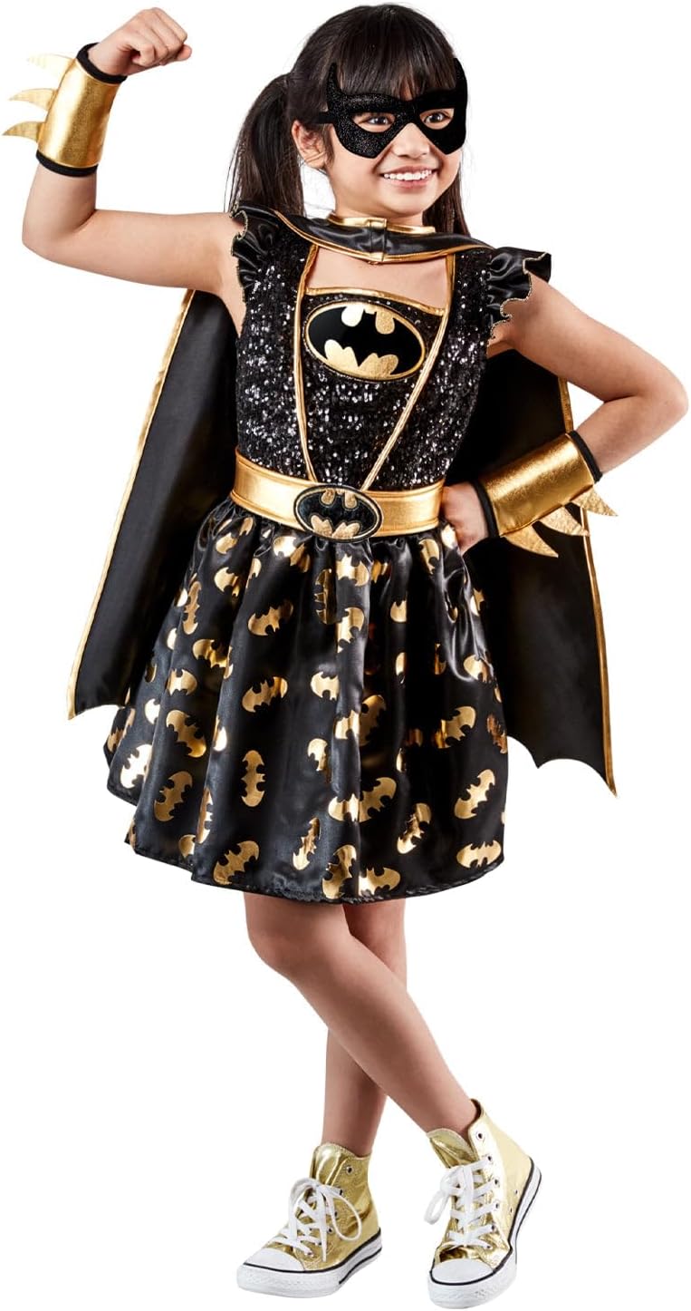 Child’s DC Comics Batgirl Costume Dress with Gauntlets, Cape, and Eye Mask includes: Dress with sequined top and patterned shirt, ruffled shoulders, detachable cape, belt, gauntlets and eye mask. NOTE: Skirt runs short on most children (depending on length of child’s legs), some will prefer to wear with tights or leggings. Officially licensed DC Comics child’s costume, look for trademark on label and packaging to help assure you’ve received authentic safety-tested item. IMPORTANT: Costumes are sized differently than apparel, use the Rubie’s Child Size Chart, do not choose based on child’s age or clothing size. Rubie’s exclusive design; look for licensed and classic costumes in sizes for children and adults. Family-focused, and based in the U.S.A. since 1951, Rubie’s has classic and licensed costumes and accessories in sizes and styles for your entire family.