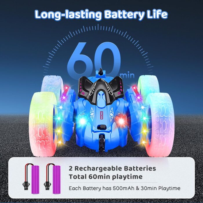 Upgraded Batteries: Equipped with a 500mAh rechargeable powerful output car battery, this remote control stunt car creates much fun for you. In addition, we also provide an extra battery for you to replace when charging.