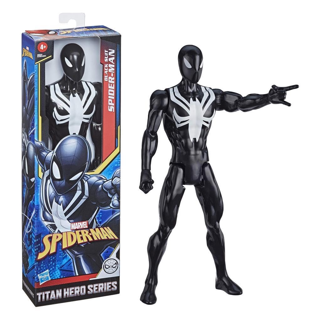 Spider-Man wears a sleek black suit to access unlimited webs, enhanced strength, and shape-shifting mastery. imagine the web-slinging hero swinging into action with the 12-inch-scale black suit Spider-Man figure from the Titan hero series! This figure includes a back port for the Titan hero blast gear launcher (not included; sold separately with Titan hero blast gear figures) so when kids connect the launcher, they can power up their figure, activate character-specific sounds and phrases, and launch projectiles! titan hero blast gear launcher sold with Titan hero blast gear figures. Each sold separately. Subject to availability. copyright 2019 Marvel.