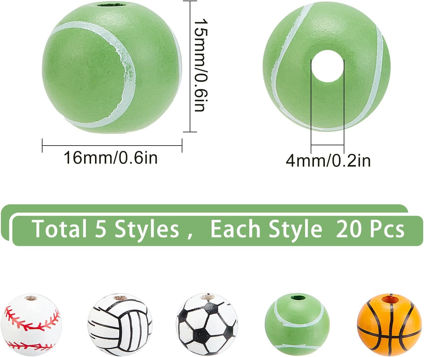 Sports Beads Size: about 0.63 inch(16mm) in diameter, 0.59 inch(15mm) thick, hole: 0.16 inch(4mm), 20pcs/style, 5 style, 100pcs.