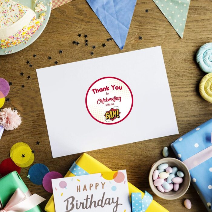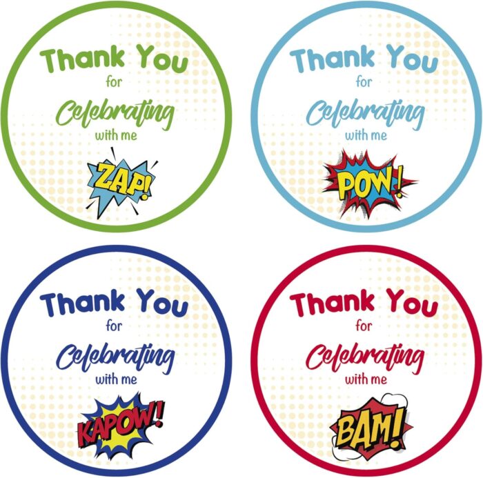 Super Hero Thank You Stickers: 60 pack of 4 different adhesive round Hero Stickers, 2 inches round in diameter and 4 different images.